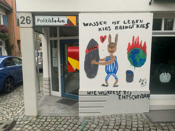 – Statement der Heinzelmännchen-Aktionsgruppe – Nachdem der Putz wieder neu grundiert wurde, haben die nächtlichen Künstler*innen der “Heinzelmännchen-Aktionsgruppe” wieder den Pinsel angelegt und dieses Mal ein Gemälde zum Thema “Wasser ist Leben, Kies bringt Kie$” geschaffen. Dargestellt ist der Politiker Raimund Haser, verkleidet als Obelix. Er umarmt herzlich einen großen Kieselstein und wendet sich ab von der brennenden Erde. “Wie würdest du entscheiden?”: Für ihn klar. Nicht die brennende Erde mit dem bereitstehenden Wassereimer löschen, sondern lieber Kies Profite für wenige.
