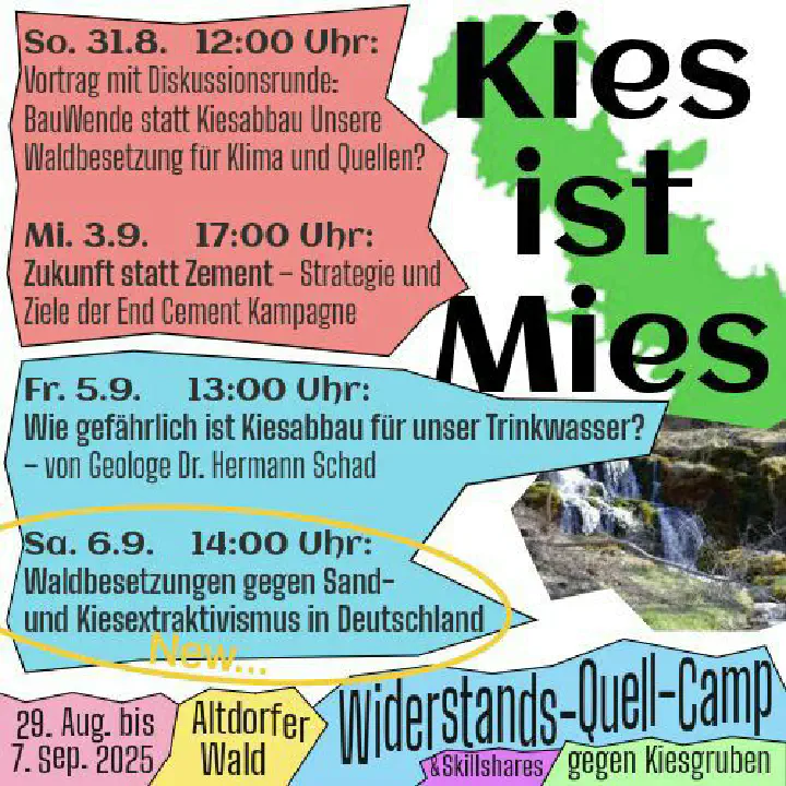Alle Inputs rund um Kies während des Widerstands-Quell-Camps. Sonntag, 31.8. 12:00Uhr Vortrag mit Diskussionsrunde: Bauwende statt Kiesabbau. Unsere Waldbesetzung für Klima und Quellen? Mittwoch, 3.9. 17:00Uhr Zukunft statt Zement - Strategie und Ziele der End Cement Kampagne Freitag, 5.9. 13:00Uhr Wie gefährlich ist Kiesaabau für unser Trinkwasser -Geologe Dr. Hermann Schad Neu: Samstag, 6.9. 14:00Uhr Waldbesetzungen gegen Sand- und Kiesextraktivismus in Deutschland Das komplette Programm findest du unter :https://ravensburg.klimacamp.eu/blog/widerstands-quell-camp/