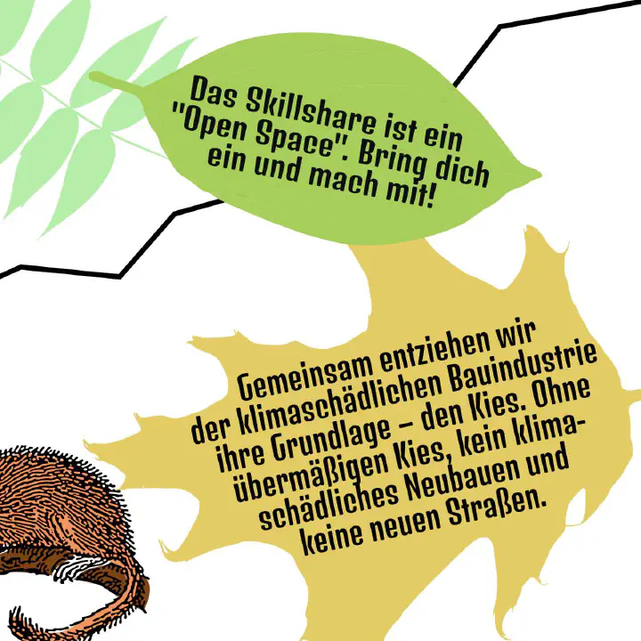 Gemeinsam entziehen wir der klimaschädlichen Bauindustrie ihre Grundlage – den Kies. ohne übermäßigen Kies, kein klimaschädliches Neubauen und keine neuen Straßen.